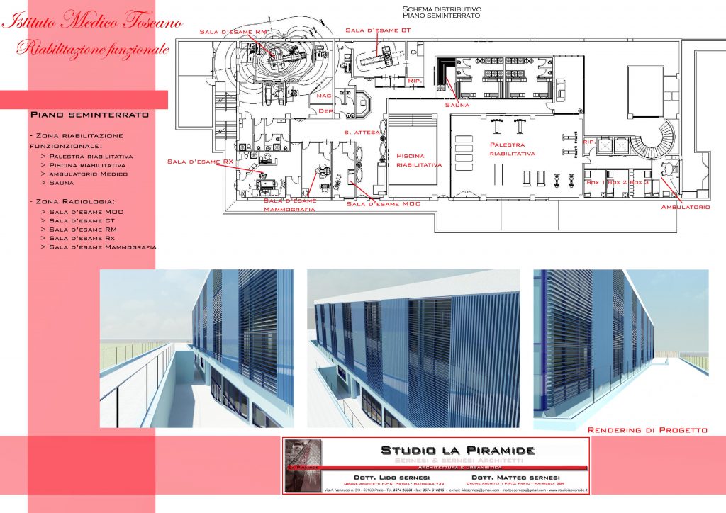 Progetto e pareri USL per ampliamento della struttura al piano seminterrato per l’inserimento di area riabilitativa e diagnostica oltre a piccole modifiche ai piani superiori si ambulatori e sale operatorie.